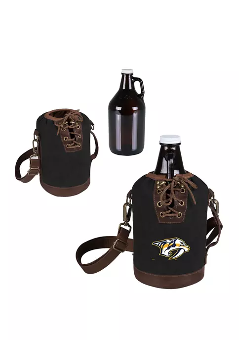 Warning: You might be tempted to name your growler once you dress it up in the NHL Nashville Predators Growler Tote, an insulated waxed cotton canvas beer bag with a water-resistant underside and adjustable shoulder strap. Lace-up straps secure the matte black stainless steel 64-ounce growler and look straight up medieval!